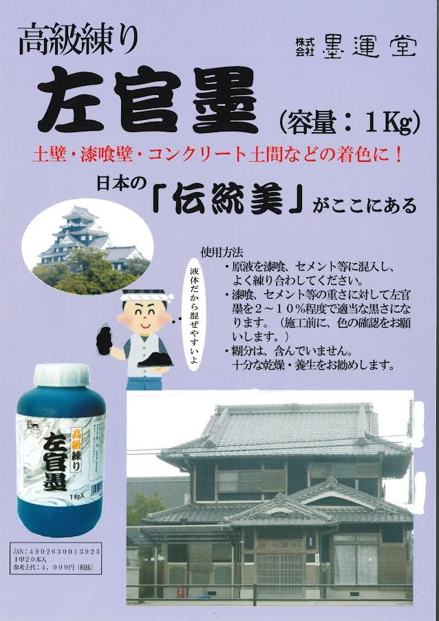 高級練り 左官墨は、土壁、しっくい壁、コンクリート土間などの着色に適した建築用の墨です。