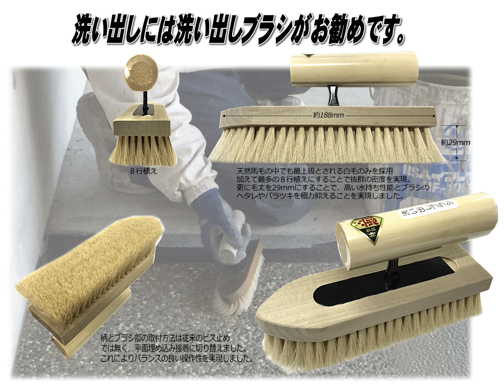 最多の植え込み量、毛丈の調整など従来型を更に進化させた洗い出しブラシです。 サイズも増えて、より効率的に作業が可能になりました。