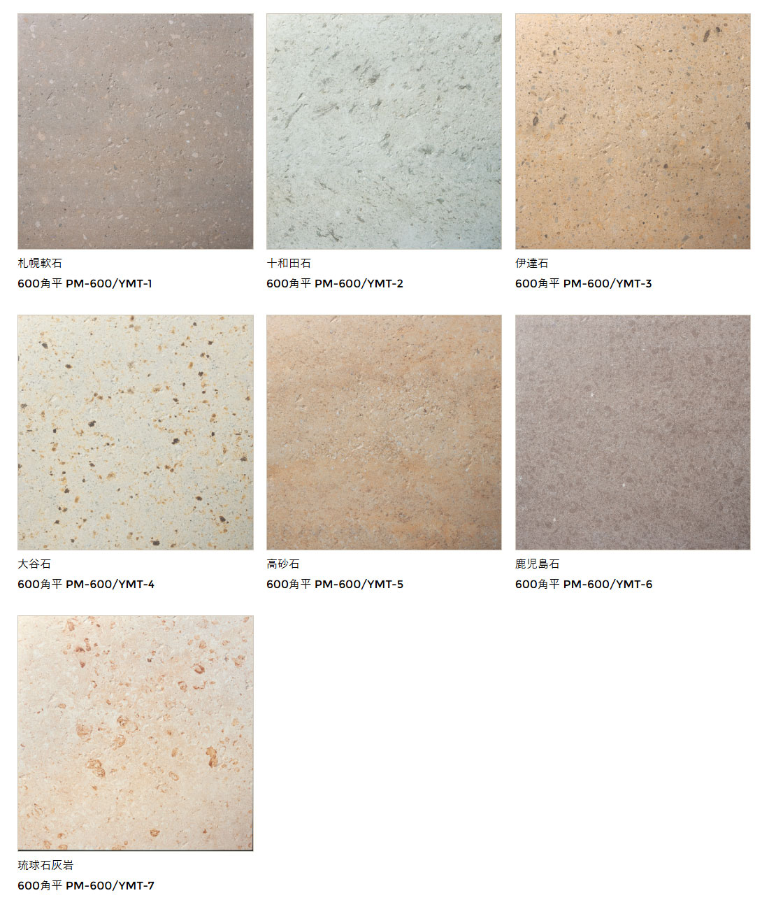 | 600角平 | PM-600/YMT- | 597×597 | - | 9.5 | 2.8枚/m² | 4枚/ケース・32kg |